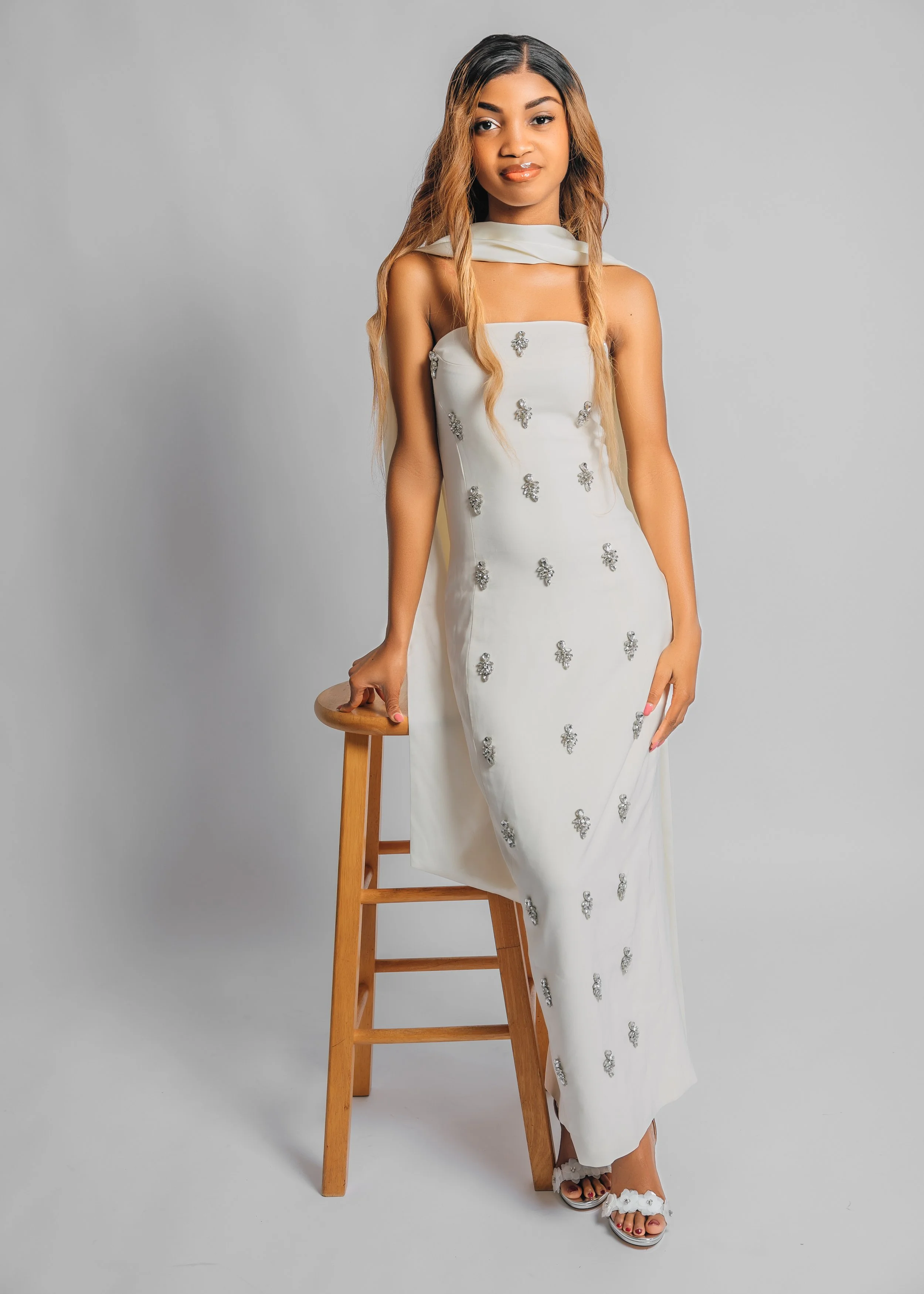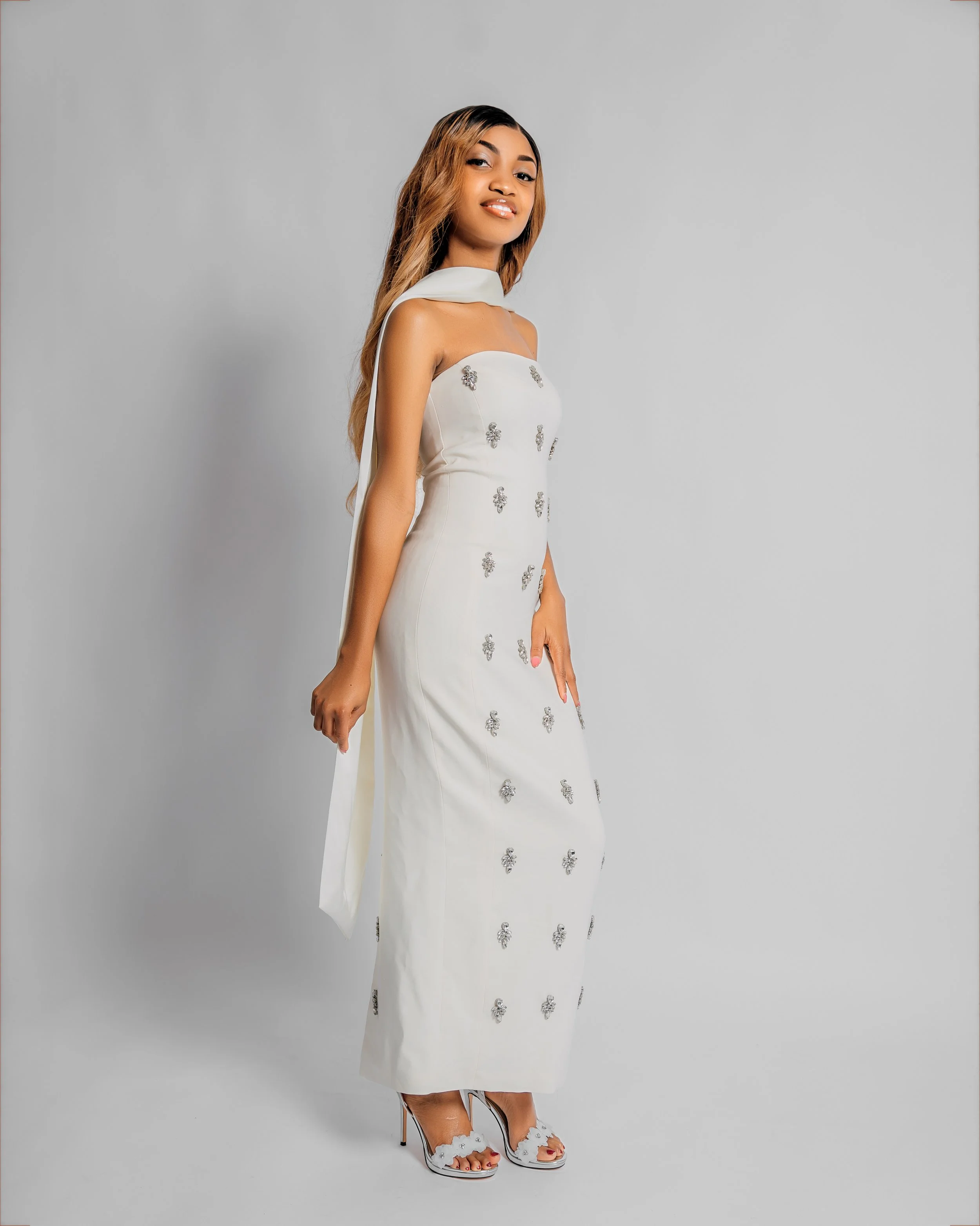 A woman in a white dress standing on an urban street at dusk, holding a gold clutch, with high heels and jewelry.