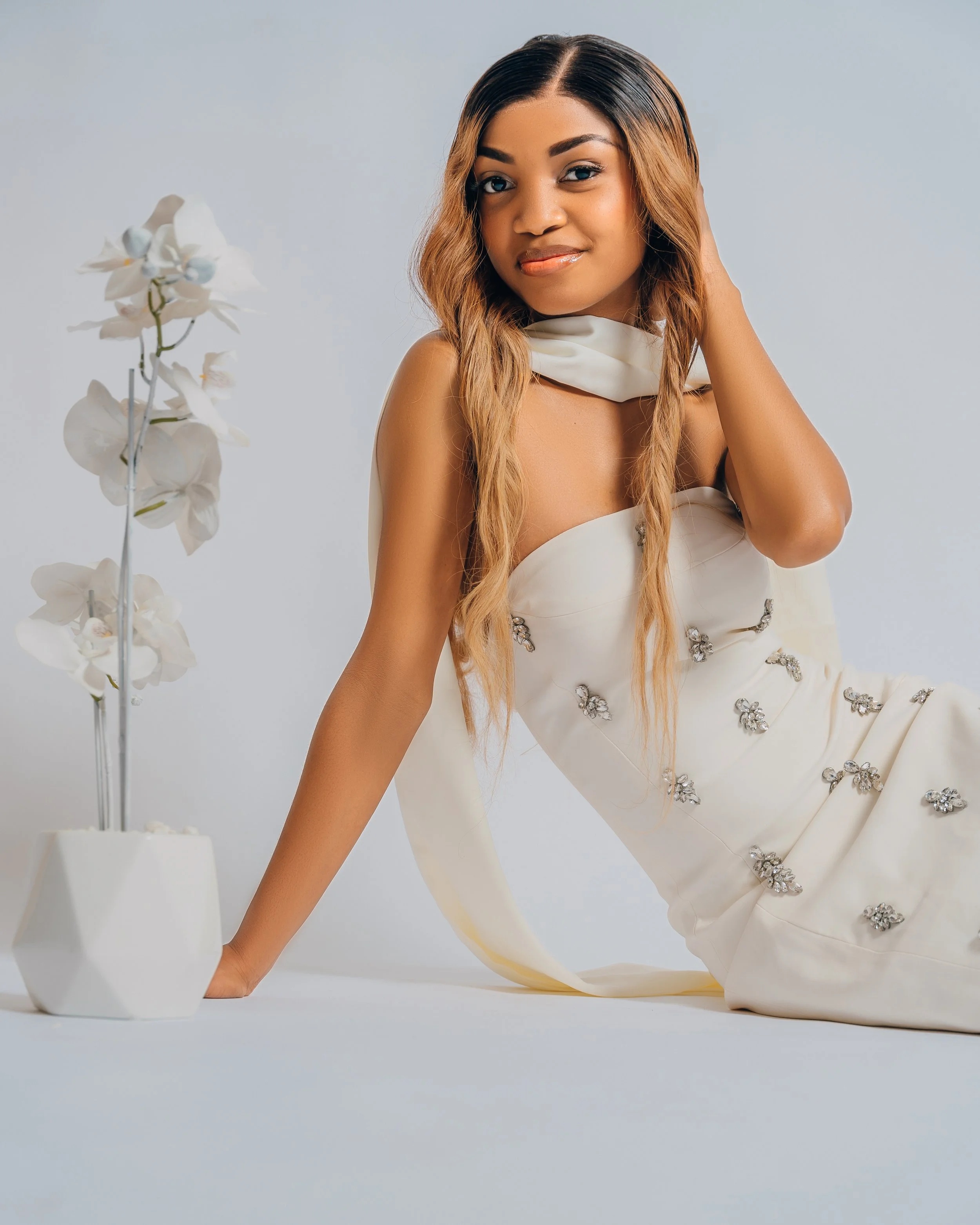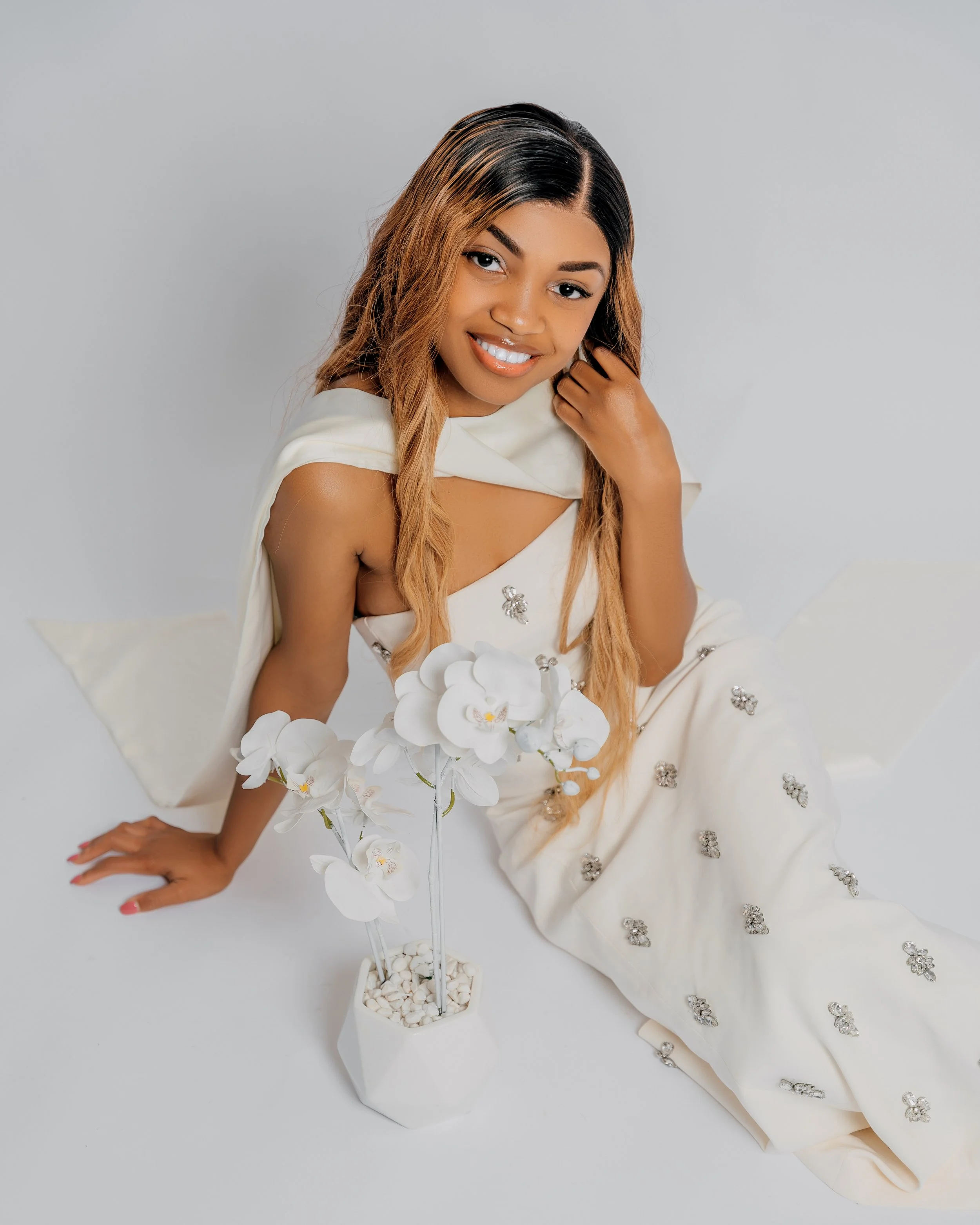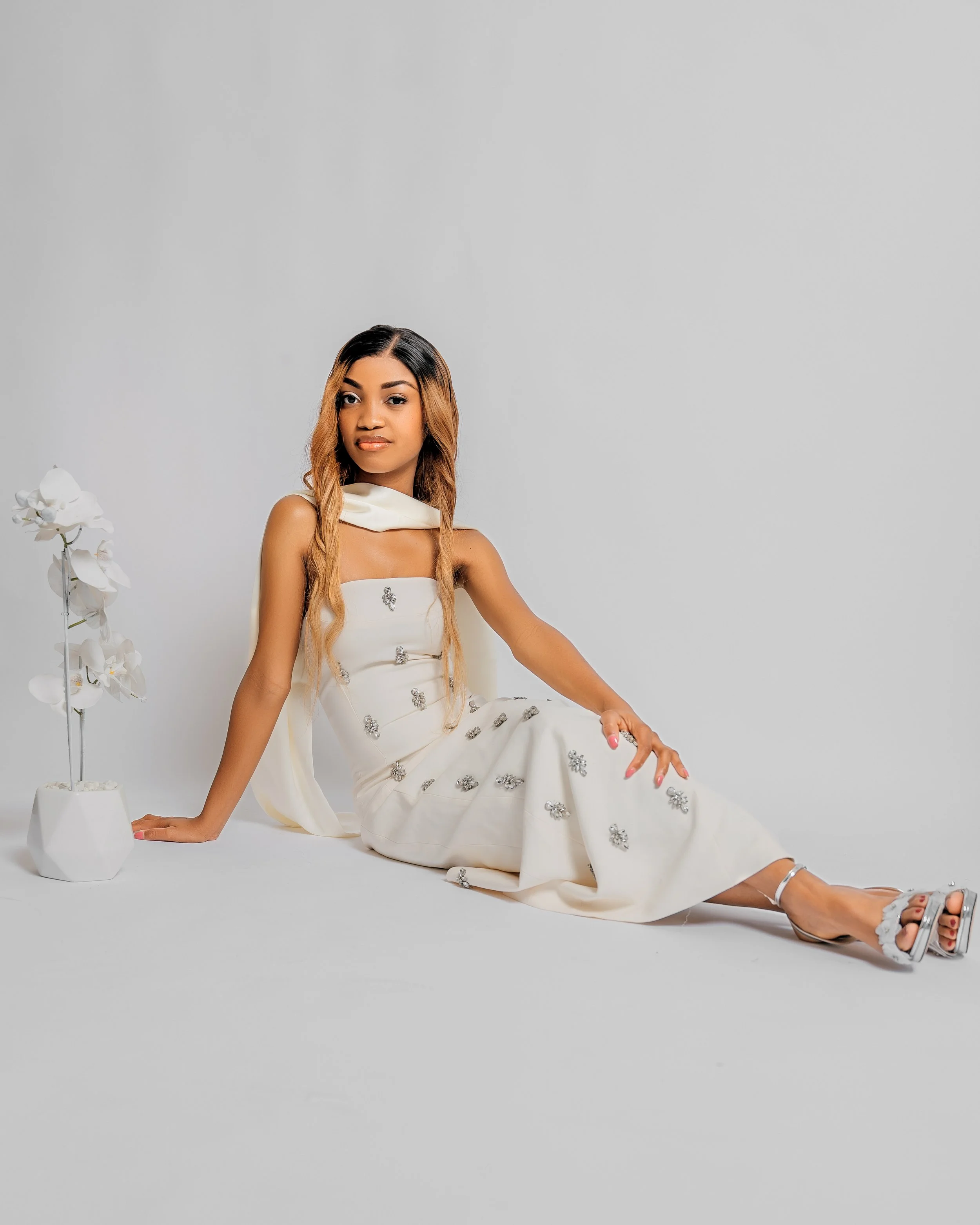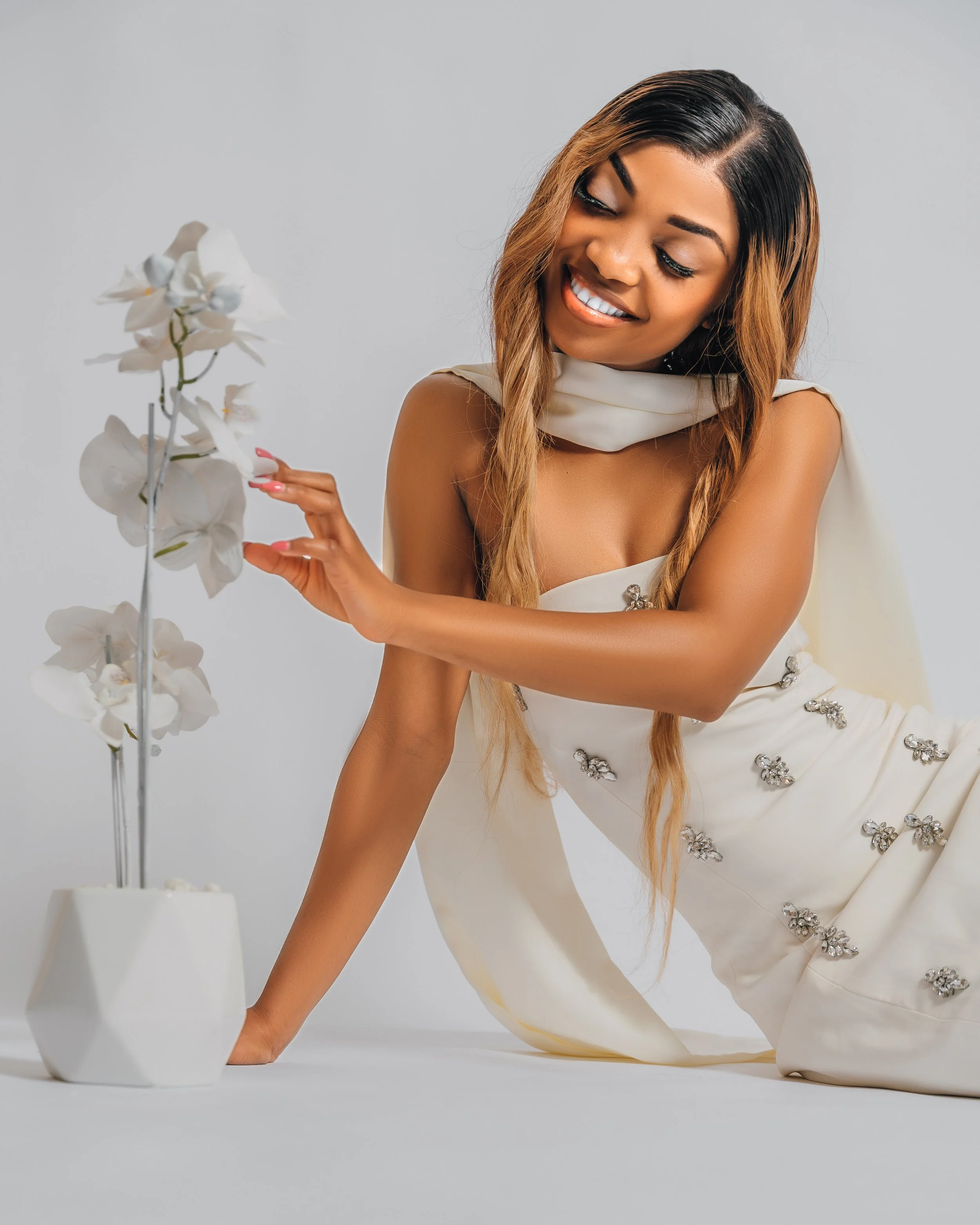 A young woman with long dark hair wearing a pink and pearl embellished dress, sitting on a pink surface against a pink background.