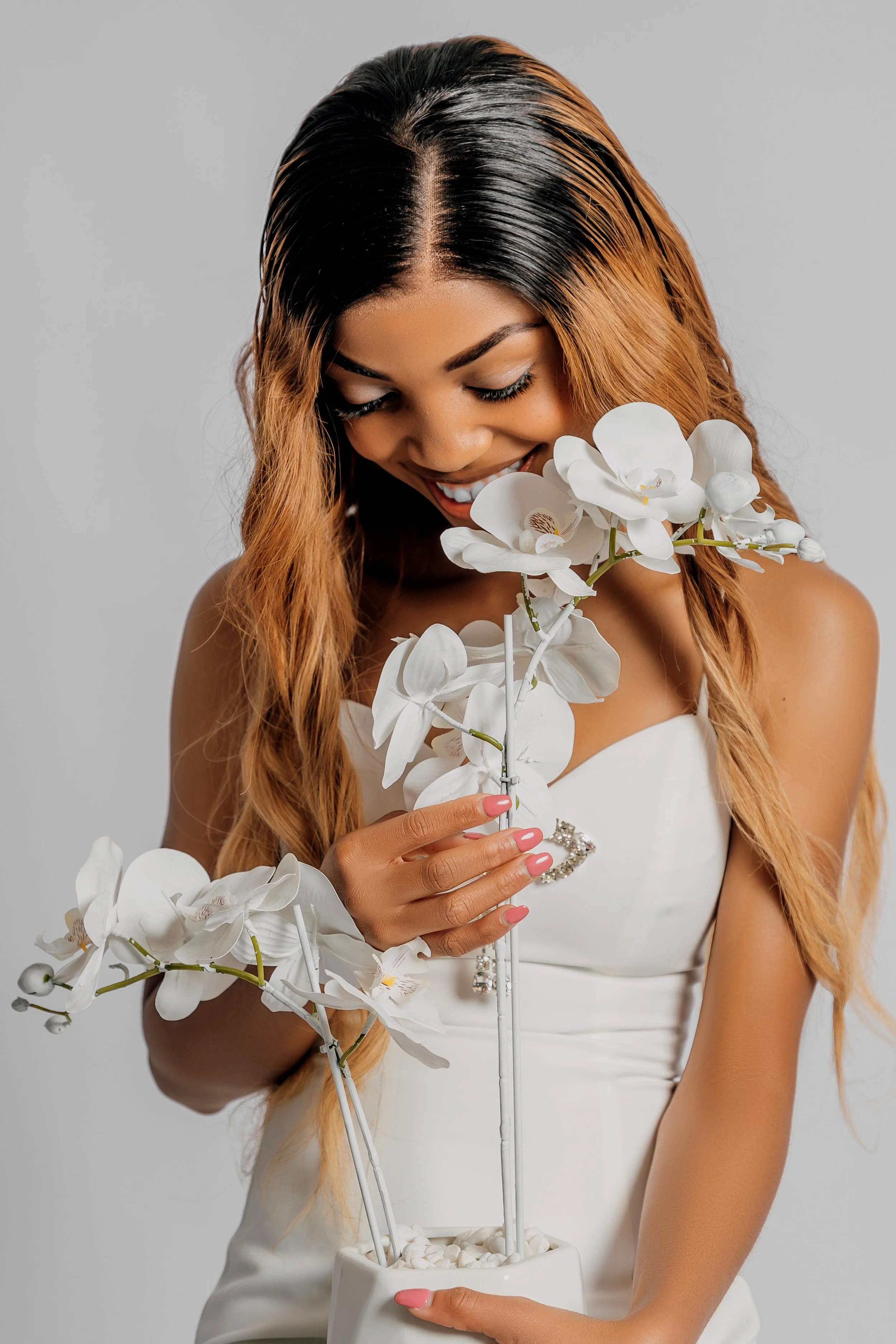 A woman in a black strapless dress holding a bouquet of red and white roses, smiling at the camera with a simple white background.